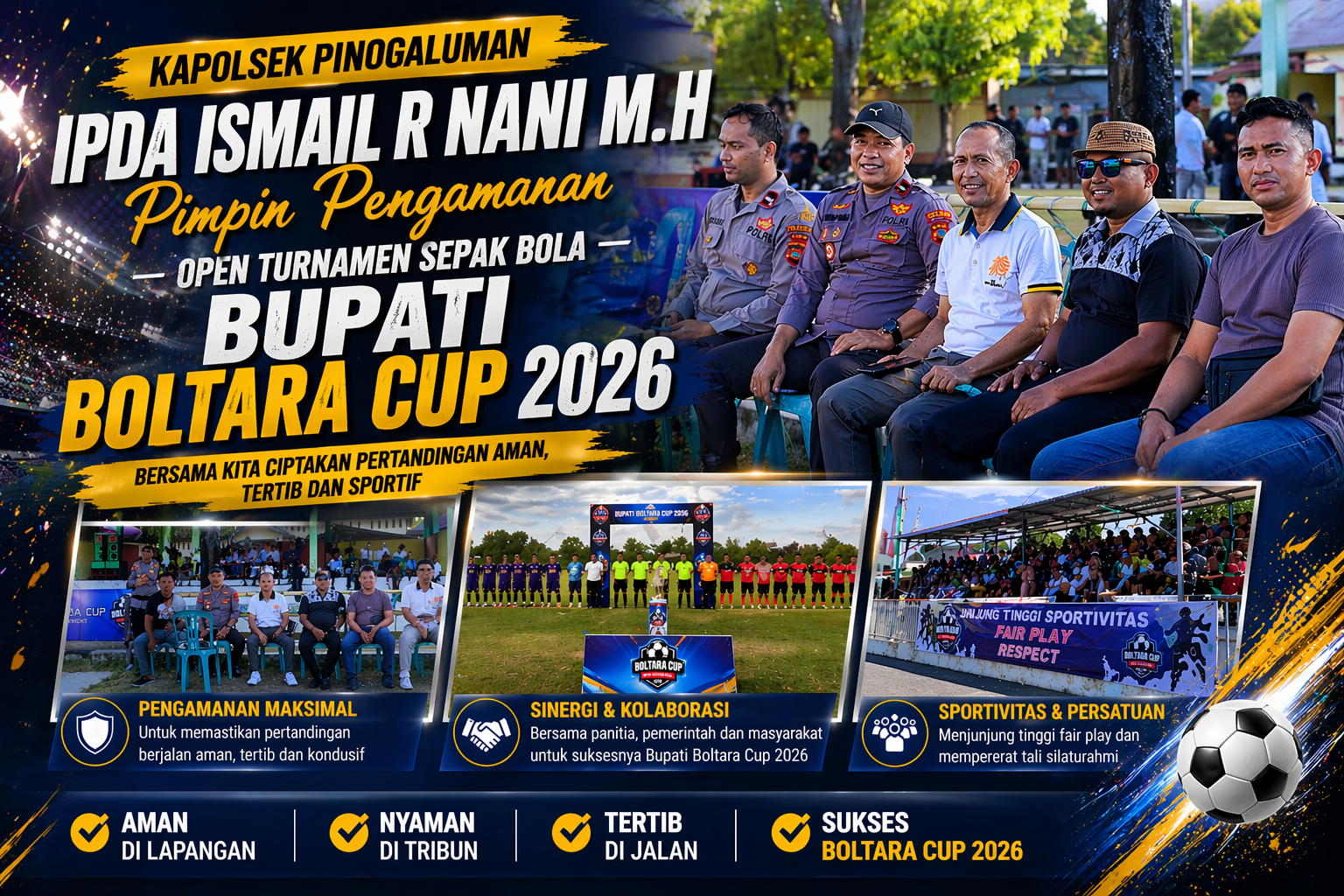 NEFAnews.Com BOLMUT — Kapolsek Pinogaluman, IPDA Ismail R. Nani, M.H., memimpin langsung pengamanan kegiatan Open Turnamen Sepak Bola Bupati Boltara Cup 2026 yang digelar di wilayah Kecamatan Pinogaluman, Kabupaten Bolaang Mongondow Utara (Bolmut).