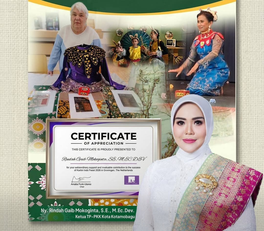Penghargaan bergengsi ini diberikan kepada Istri Wali Kota Kotamobagu, Rindah Gaib., atas dedikasi dan karyanya dalam menciptakan kain tenun tradisional khas Kotamobagu dengan motif Morindap, Motomoman, dan Hamsey yang dikenakan para penari Kabela saat tampil di acara Kartini Fest Indo 2026, di Groningen, Belanda. Sabtu (25/4/2026).