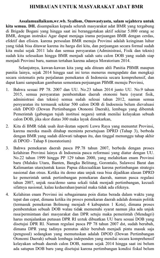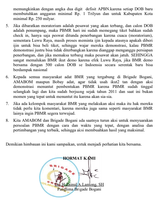 Oleh sebab itu, Panglima meminta Kepada semua masyarakat adat BMR yang tergabung di Brigade Bogani, AMABOM maupun Bobay adat, agar tidak terlibat aksi yang menuntut pembentukan PBMR.