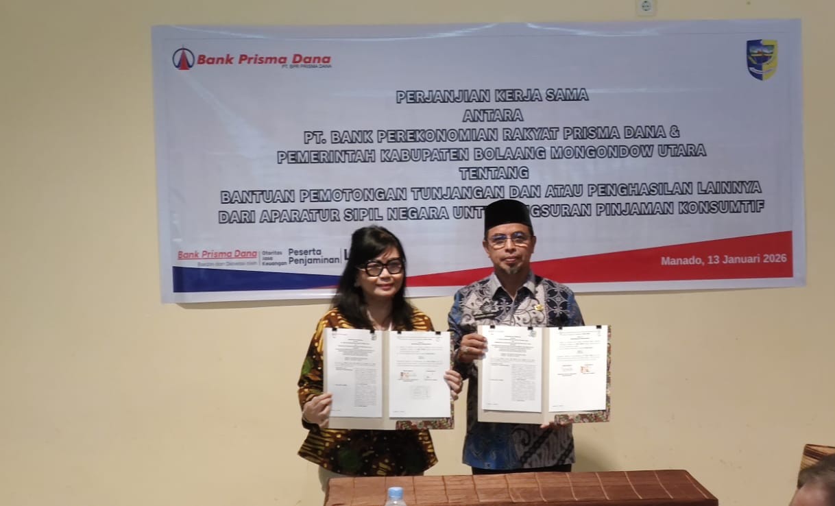 NefaNews.Com BOLMUT – Pemerintah Daerah Kabupaten Bolaang Mongondow Utara (Bolmut) resmi menandatangani Nota Kesepahaman Memorandum of Understanding (MoU) bersama PT. Bank Perekonomian Rakyat (BPR) Prisma Dana terkait mekanisme pemotongan tunjangan dan/atau penghasilan lainnya dari Aparatur Sipil Negara (ASN) untuk angsuran pinjaman konsumtif. Selasa (13/01/2026.