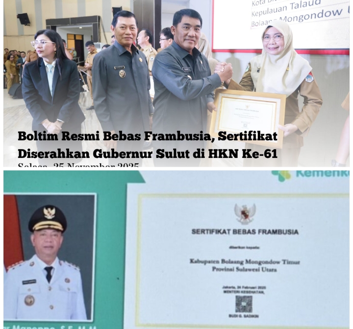 NEFAnews.com – Pemerintah Kabupaten Bolaang Mongondow Timur (Boltim) resmi menerima sertifikat bebas Frambusia tepat dihari peringatan Hari Kesehatan Nasional (HKN) ke-61 Tahun.