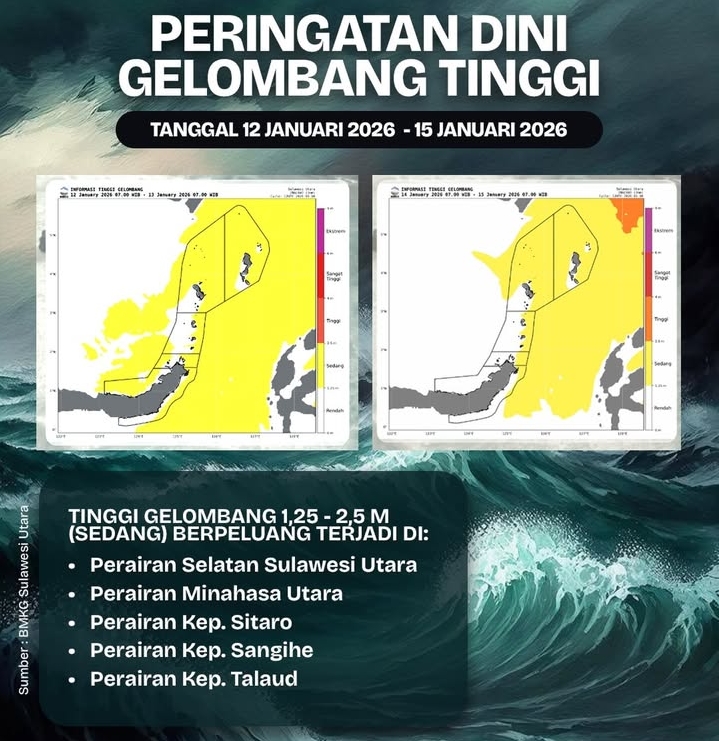 Informasi ini disampaikan oleh pemerintah sulut, melalui Platform resmi media sosial Instagram milik Pemerintah Provinsi Sulut kepada Warga Kawanua, agar lebih berhati-hati menghadapi cuaca ekstrem disertai tinggi gelombang yang diperkirakan akan menerjang sejumlah wilayah perairan di Sulut mulai tanggal 12-15 januari pukul:08.00 WITA.